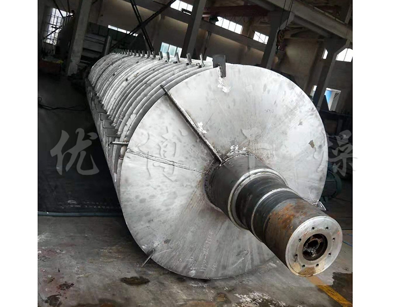 空心軸上密集排列著楔型中空漿葉,熱介質(zhì)經(jīng)空心軸流經(jīng)漿葉。單位有效容積內(nèi)傳熱面積很大,熱介質(zhì)可以是水蒸汽,也可以是熱水或?qū)嵊偷?。傳熱介質(zhì)通過(guò)旋轉(zhuǎn)接頭,流經(jīng)殼體夾套及空心攪拌軸,空心攪拌軸依據(jù)熱介質(zhì)的類型而具有不同的內(nèi)部結(jié)構(gòu),以保證佳的傳熱效果。